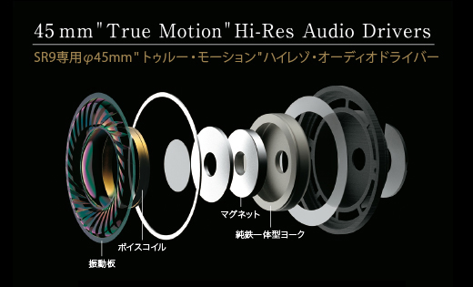 極薄の振動板には「DLC(Diamond Like Carbon)コーティング」をかけた。これにより振動板の剛性が高まり、さらに良好な高域特性が得られる。ドライバーの駆動力を高めるため、大型のマグネットと純鉄一体型ヨークを配置して磁気回路を強化したこともSR9の特徴だが、その結果としてMSR7を超える情報量と解像感の獲得につながった。