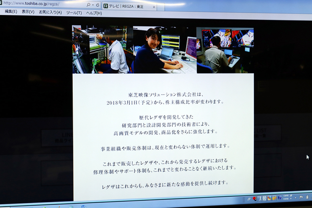 まず事実関係を整理しておこう。11月14日時点でのニュースリリースには「株式譲渡後も東芝映像ソリューションの社名変更などは行われず、TOSHIBA・REGZAブランド映像商品の自社開発・販売・修理を継続する」旨が記載されていた。