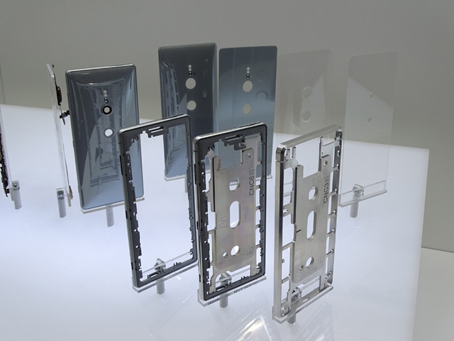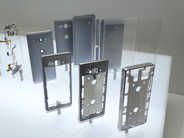 曲げた後に、側面のメタルフレームにピタリと合うように加工する技術にも熟練が必要。XZ2のリアパネルはガラスに反射する光の「流れと輝き」を表現している。XZ2 Compactは透明な樹脂素材の裏側から着色して、淡い色あいを表現した。表側にはフロスト加工をかけて光を拡散。手触りも心地よく滑りにくい。