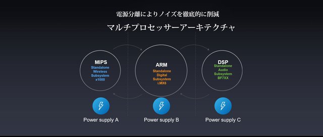 こうした豊富な機能を最適に動作させるために採用されたのが、この3つのプロセッサーだ。その内約は、内部にコントロールを司るARM、オーディオ処理を行うDSP、そしてPAW Gold TOUCHに搭載されたワイヤレス機能を動作させるMIPS。さらには、これらそれぞれにOSを搭載し、さらには電源供給からセパレートすることで驚異的な動作の早さと理想的な音声処理を実現した。