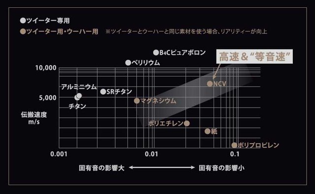 NCVが進化しているポイントのひとつが伝搬速度です。第1世代では約5,000m/s、それが第4世代では6,300m/sです。どうやら6,000m/sくらいがウーファーのスレッショルドで、速くなって凄くよくなります。ところが、従来の紙のような「ドワン」という音ではなく、「ポン」と立ち上がって「ポン」と切れる、これまで聴いたことがない音のため、最初は戸惑いますし、嫌がる人もいて、新素材の評価が分かれがちです。ところがその嫌がっていた人たちも、「最近聴くとなんかいいよね」と言い始めました。それは、熟成が進んだからなんだと僕たちもだいぶわかってきました。