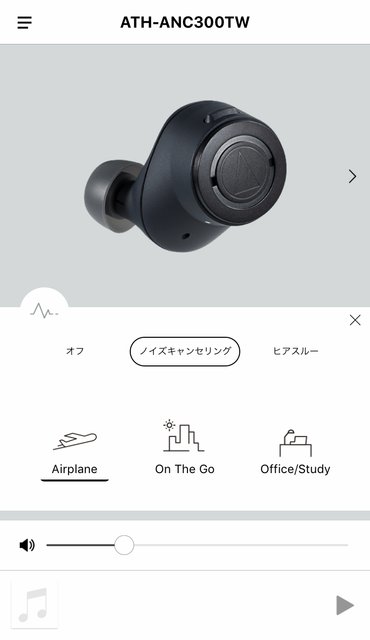 −− ATH-ANC300TWは着けるだけで周りの音がほとんど聞こえなくなりますが、これはそのフィット感のおかげです。耳にピッタリとハマるから、落ちる心配がなく、音漏れもせず、かつ遮音性も高いわけですね。さらに「ノイズキャンセリング機能」を使うと、もっと外音を遮断できます。