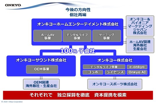 OEM事業はオンキヨーサウンド株式会社、e-onkyo music、onkyo direct、コラボ商品、onkyo sports、カスタムIEM、発酵、聴診器、オンキヨーブランドのデジタルライフ事業、オンキヨーブランドのライセンス事業など、その他の事業はオンキヨー株式会社とし、それぞれ上場会社オンキヨーホームエンターテイメントの100%子会社とします。各事業は、他の事業や他人への責任転嫁を止め、自分の事業体での独立採算を徹底していきます。各事業の足腰を強化し、それらが重なりあうことで次世代に強いオンキヨーを目指します。