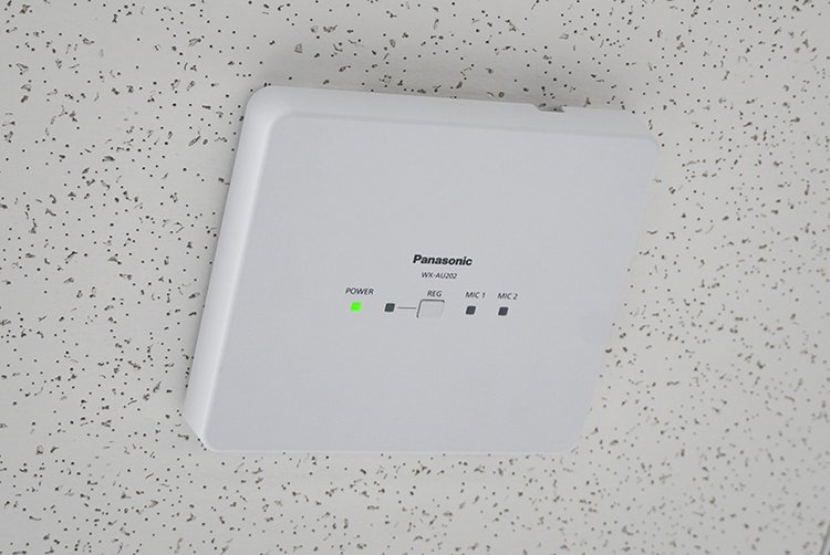 また、WX-AM800独自の仕様として、シーリングマイクのみならず同社製ワイヤレスマイクとの併用にも対応する。シーリングマイクにダイバーシティ受信方式のワイヤレスアンテナユニット「WX-AU202」を1台連携することで、同社製の1.9GHz帯ワイヤレスマイクとの併用が最大2本まで行える。