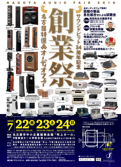 名古屋のオーディオ専門店 サウンドピットは、同社の34周年を記念した創業祭「名古屋特選品オーディオフェア」を7月22日〜24日に開催する。会場は名古屋市中小企業振興会館「吹上ホール」。