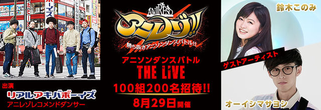 今回開催が決定したLIVEイベントは、この「アニレゾ!!」でバックで流れるアニソンを、アーティストの生歌唱にしてダンスバトルを行うというもの。進行はRAB、そしてゲストアーティストにはオーイシマサヨシと鈴木このみの2名が出演する。ダンスバトルに出演するのは「アニレゾ!!」に出場し、強力なインパクトを残した8名のレコメンドダンサーたち。