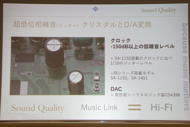 D/A変換において重要な役目を果たすクロック回路には、-150dB以上の低雑音レベルを実現する超低位相雑音クリスタルを採用している。このクロックはトップエンド機「SA-11S3」や「SA-14S1」に搭載されたものと同一品で、「SA-11S2」のクロックに比べて1/10のジッターレベルを誇るという。