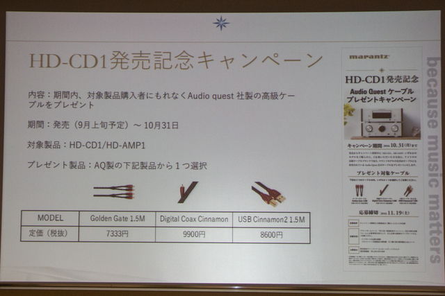 なお、本製品の発売に合わせて、キャンペーンも実施。9月上旬から10月31日までにHD-CD1またはHD-AMP1を購入すると、同社が取り扱うAudio Questのケーブル(RCAインターコネクトケーブル「Golden Gate」/デジタルケーブル「Cinnamon」/USBケーブル「Cinnamon2」のいずれか)がプレゼントされる。