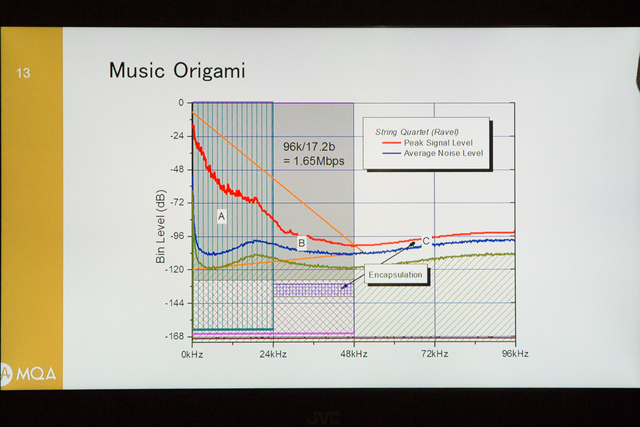 一方、前述のように「音質と利便性を共に伸ばす」ことを目的としたMQAでは、ハイレゾ音源のファイルサイズが膨大で扱いにくいという問題に対処する取り組みも行われた。ここで用いられたのがMQAが「ミュージック・オリガミ」と呼ぶ手法だ。ハイレゾ音源の膨大なデータ領域の中で、可聴帯域外の部分を暗騒音の部分などへと埋め込んでいく(「エンカプセレーションする」と同社は呼ぶ)というもの。こうして膨大な情報を折り紙のように折りたたむことで、ファイルサイズを劇的に小さくすることが可能になった。