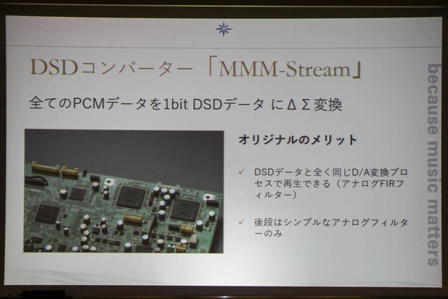 MMM-Conversionでは、MMM-Streamから入力される1bit DSD信号をアナログFIRフィルターによってダイレクトにD/A変換する。シンプルな回路でD/A変換を行うことで、原音に忠実なアナログ信号を得ることができるという。