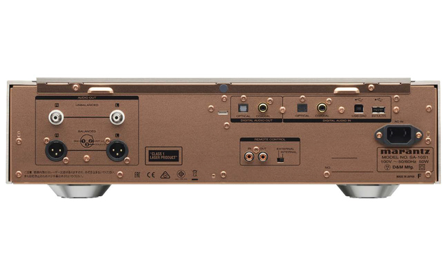 SACD/CDに加えて、各種ハイレゾ音源を保存したデータディスクの再生も可能。USB-DACは11.2MHz DSDや384kHz/32bitの再生に対応する。またUSB-A端子からUSBストレージに保存したハイレゾ音楽を再生できる。アナログ音声出力端子はバランスXLRを1系統、アンバランスRCAを1系統備える。