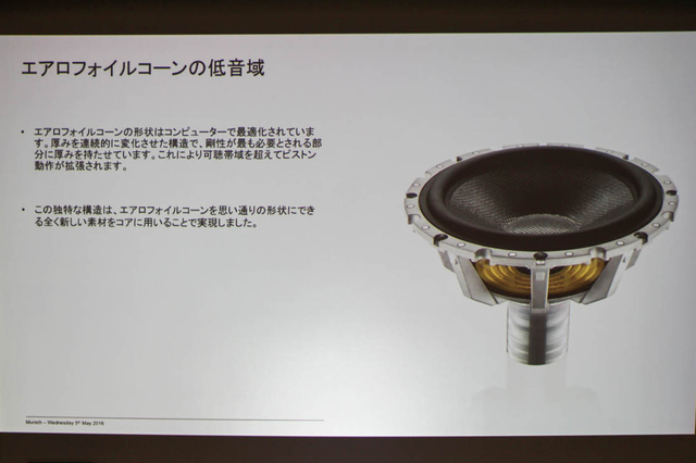 800 D3の音質を決定付ける最も大きな要素が、改良されたエアロフォイル・コーン・ウーファーだという。「エアロフォイル・コーン」は、同シリーズの802 D3/803 D3/804 D3にも採用されている。このエアロフォイル・コーンは、潜水艦の内壁などに使われる特殊な樹脂素材(シンタクティック素材)を用いるとともに、コンピューター解析で最適な形状を算出。コーンの厚みに変化を持たせることで、必要な位置に最大限の強度を確保している。