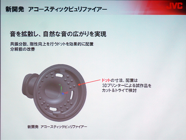 加えて、何度も試作を繰り返してドットの最適な配置位置を探った新開発のパーツ「アコースティックピュリファイアー」も搭載。ドット(凹凸)によって共振分散および剛性向上を行い、分解能の改善を図っている。