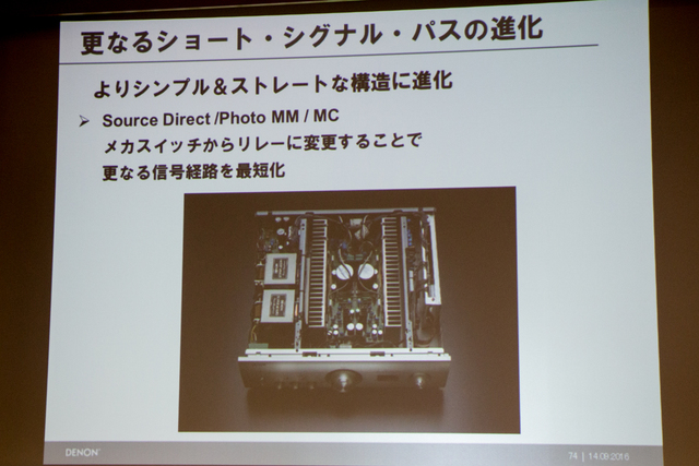 ショート・シグナルパスの進化については、PMA-SX11やPMA-2500NEで掲げた“シンプル&ストレート構造”が本機でも実践された。具体的には、「ソースダイレクト」「MM/MCフォノ」の切り替えを、メカスイッチからリレーに変更することで、さらなる信号経路の最短化を実現した。