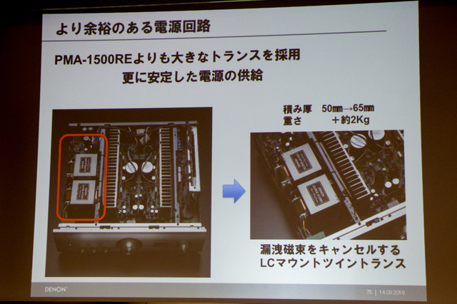 電源回路は、PMA-1500REよりも大きなEIトランスを採用することで電源供給の安定度を強化。トランスの厚みは従来の50mmから65mmへ、質量も約2kgアップしたという。また、漏洩磁束をキャンセルするLCマウントツイントランス構成を採用する。