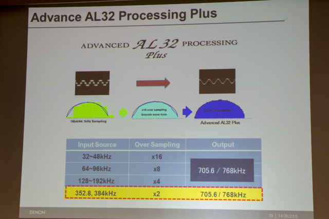 デジタル入力の搭載に伴って、デノンのアナログ波形再現技術「Advanced AL32 Processing Plus」も搭載。352.8kHz・384kHzの信号も含むデジタル信号に対してアップサンプリングを行い、705.6・768kHzの出力にて処理を実施。原音に忠実な補完を行うことで、元の波形に近いアナログ信号を実現する。