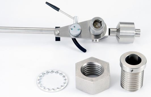 有効長は232mm±3mmで、実効長は214mm。ヘッドシェルはユニバーサル式で、簡単に交換ができる。出力端子は5pin DIN(ロジウムメッキ)。設置孔サイズはφ30mmで、適合ベースはFR-64用、WE-308N用に準じる。ベース部には同社オリジナルの「ほぼ万能型ベース」を付属し、幅広いターンテーブルに装着できる設計としている。