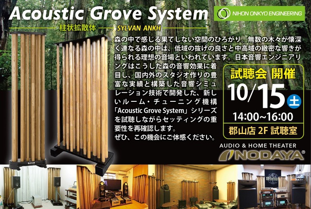 日本音響エンジニアリングは、ルームチューニングアイテム“AGS”(Acoustic Grove System)「SYLVAN」「ANKH」各モデルの試聴会を今週末の10月15日(土)に、福島・のだや郡山店で開催する。