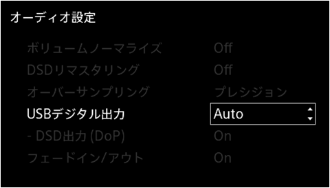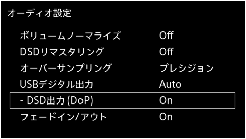 USBデジタル出力については、DSDはDoP出力のみに対応。ホームメニューの「設定」>「オーディオ設定」に「USBデジタル出力-DSD出力(DoP)」というメニューが新たに追加される。本機能はオンオフを選択できる。