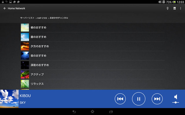 具体的には、サーバーリスト上に見える、HAP独自機能の「おまかせチャンネル」や「お気に入り」など、また「ジャンル」「アーティスト名」「アルバム」「プレイリスト」など、HDD内のフォルダ階層とは別の、HAPデータベース上で構築した情報を基にしたサーバーリストが表示され、そこからHAP本体と同様の選曲が可能。もちろん、HDD内のフォルダ階層そのままを表示する「フォルダ」(メニュー)からも選曲できる。