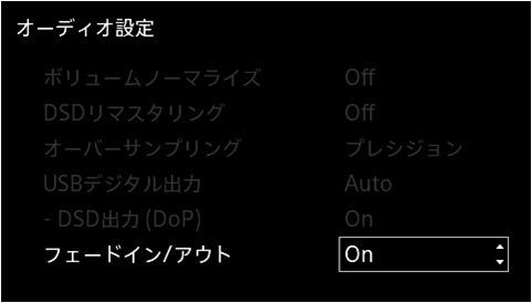 フェードイン/アウト機能は、同じくホームメニューの「設定」>「オーディオ設定」に「フェードイン/フェードアウト」という項目を追加。こちらもオンオフを選択できる。