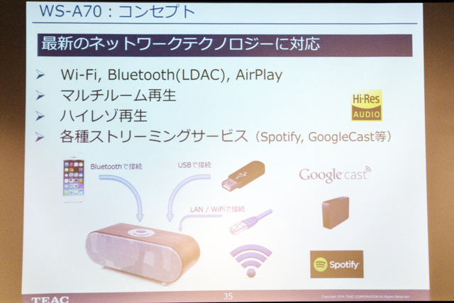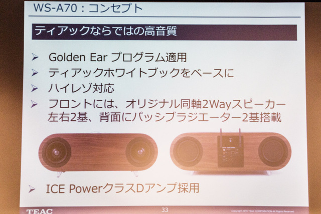 ティアックは、“New Vintage”をキーワードにした新製品群を発表した。本稿では、ハイレゾ対応のオールインワン・ネットワークコンポ「WS-A70」について紹介する。発売は2017年春を予定し、価格は未定。