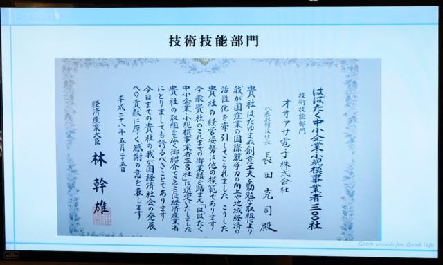 また、オオアサ電子代表取締役社長の長田克司氏は、同社が地域に根付いた活動を行っていると説明した上で、本拠地を置く広島での事業について紹介。光学・液晶事業や環境エネルギー事業などと共に、映像音響事業を行うなかで「会社が低迷の時期にあっても社員を優先し、人が主役のモノ作りを徹底してきた。その取り組みから生まれた繋がりで、製品の開発において様々な協力を得ることができた」と語った。