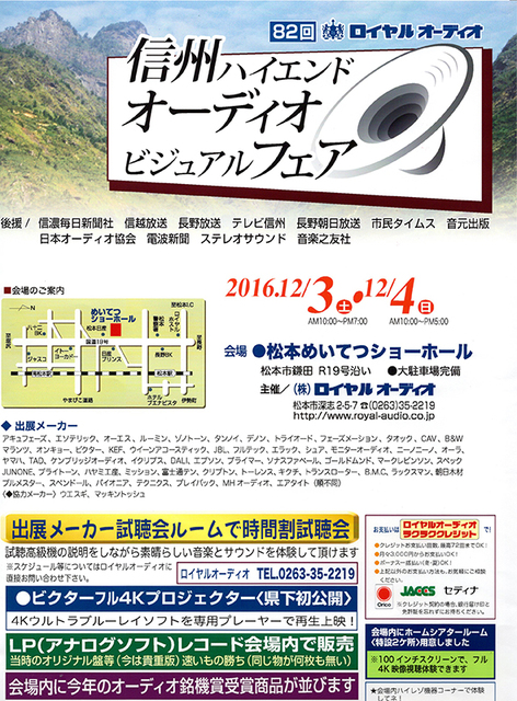 12月3日(土)、4日(日)の2日間にわたって、長野県松本市のオーディオショップ、ロイヤルオーディオが主催する「信州ハイエンドオーディオビジュアルフェア」が開催される。信州地区では最大規模のオーディオ&ビジュアルイベントとなっている。