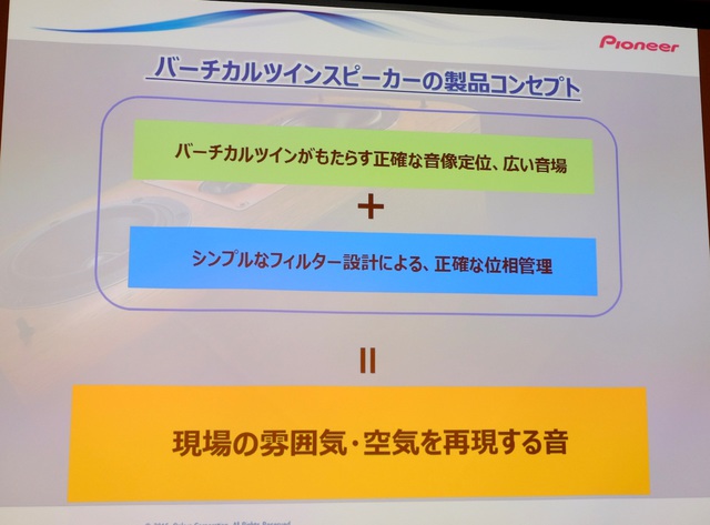 同社では今回、このバーチカルツイン方式を復活させたことについて「パイオニアとしてスピーカーを開発することになり、ではパイオニアらしいスピーカーは何かと考えた時に、バーチカルツイン方式、そしてピュアモルト材という発想になりました」と語った。