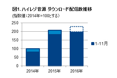 2016年に入っても各月で前年実績を上回って推移しており、2016年1月〜11月計では前年比10%増となった。アニメジャンルが市場を牽引していることに加え、J-POPなどでラインナップが増え、ユーザーのすそ野が広がっているとのこと。また、2016年はアルバム(まとめ買い)が好調なこともあって平均単価が上昇。1月〜11月のダウンロード金額は前年比11%増と数量を上回る成長となった。