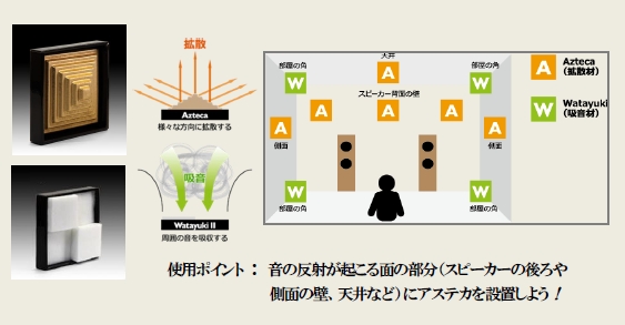 会場にはKRYNA(株)の協力を得て、手頃に体験できるユニークで効果的な製品として拡散材「Azteca(アステカ)」と吸音材「Watayuki ?(ワタユキ)」を用意。同社の鈴木孝夫氏をゲスト/講師に招き、「拡散材と吸音材の設置と効果」をさまざまな使用ポイントでの再生音の違いを実際に体験する予定となっている。