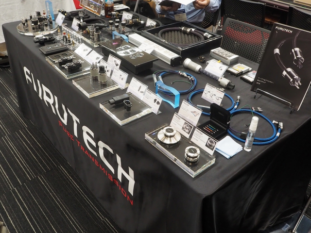 ここからは2階ホールの各ブースの模様をお伝えする。フルテックは、同社のケーブルやアクセサリーなどを一斉展示。アナログ再生関連では、レコード用スタビライザー「Monza」「Monaco」やシェルリードワイヤー「La source 103」、各種フォノケーブルなどを展示していた。47研究所は、2枚の純アルミ製プラッターを1本のベルトで別々の方向に回し、振動を相殺するというユニークなターンテーブル「Model 4724 Koma」を出展した。