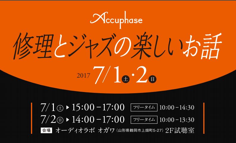アキュフェーズ(株)は、「修理とジャズの楽しいお話」と題した試聴会を、山形県鶴岡市のオーディオラボオガワで開催する。