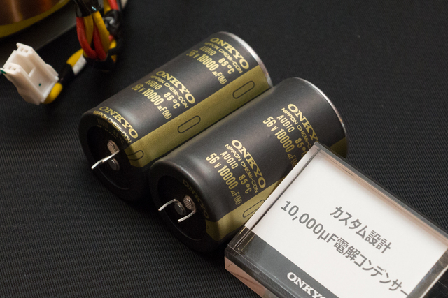 電源部には大容量のEI型トランスや、カスタム設計となる容量10,000μFの電解コンデンサーを2基搭載。また、電源コンデンサーからパワートランジスタまでを銅バスプレートで接続することで、低インピーダンスかつ強力な電源回路を実現したとする。