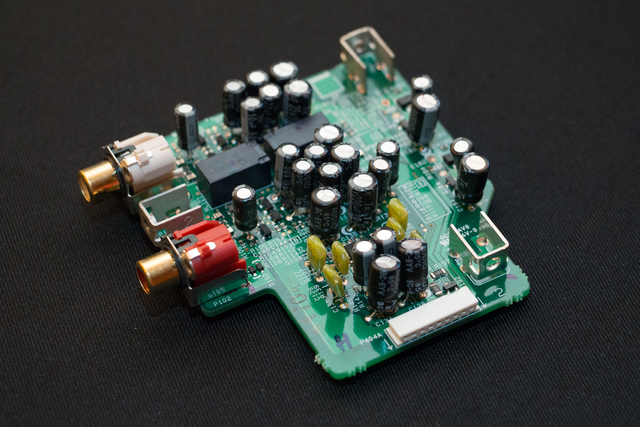本機のポイントとなるのが、この価格帯でMM/MCカートリッジに対応した独立専用基板のフォノイコライザーを採用したことだ。MC部には厳格な試聴テストを経て選別されたディスクリート構成のヘッドアンプを採用。また、MM/MCの切り替えスイッチをプッシュ式ではなくリレー式として、基板上の経路を短縮化。グランドラインのループを閉じてそれぞれ別々にアースをとることで(閉ループ化)、繊細なアナログ信号をより純粋に増幅することを狙っている。