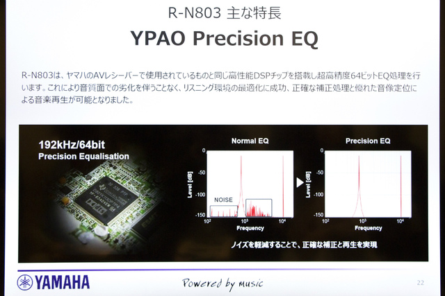 EQを動作させるDSPチップはAVアンプで使用されるものと同等で、音質劣化を抑えた高精度64bit処理の「YPAO Precision EQ」。同社によれば「192kHz/24bit信号まで対応した64bit処理により、聴感上の音質劣化なく補正を行うことができるため、今回のHi-Fi製品への導入が実現できた」とのこと。なお、DSP回路を通さず信号を流す「ピュアダイレクトモード」も利用できる。