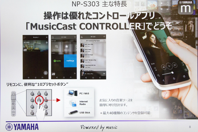 10個のプリセットボタン備えた専用リモコンが付属。プリセットボタンにはよく聴く音楽ソースを登録でき、ボタンの組み合わせで最大40種類のコンテンツを記録できる。また、同社の操作アプリ「MusicCast CONTROLLER」によるリモート操作にも対応している。