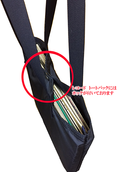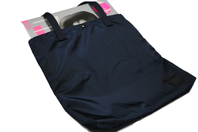 付属のトートバッグは、素材はナイロンツイル生地を採用。12inchのアナログレコードが数枚入れることができる。また、バッグの口の部分にはホックがついてるので中身の飛び出しも防げる。使わないときは折りたたんで、ショルダーポーチの外側に設けられたファスナーポケットに収納することが可能だ。