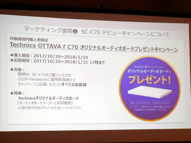 10月20日から2018年1月19日のあいだ、SC-C70を購入し、CLUB Panaconicに愛用者登録し、キャンペーンに応募すると、テクニクスとオーディオボードメーカーが共同開発した5層構造のボードを全員にプレゼントする。応募期間は10月20日から2018年1月31日 17時まで。