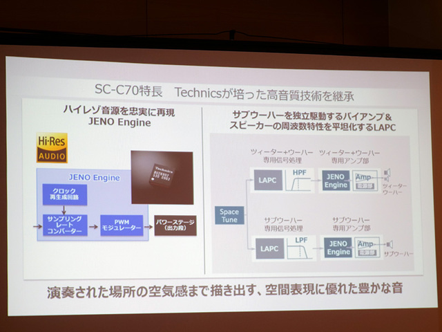 またSC-C70には、これまでテクニクスが培った高音質技術を継承。歪み、ノイズ、ジッターを抑えたフルデジタルアンプ「JENO Engine」を搭載しているほか、アンプの特性を最適化する負荷適合アルゴリズム「LAPC」も、トゥイーター+ウーファー用とサブウーファー用の2系統を備えている。