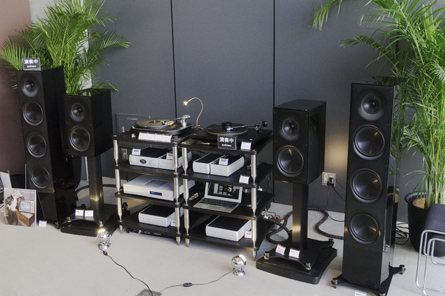 エンクロージャーはチャンバーで区切られ、ドライバーの振動が互いに干渉しない設計「インターポート・カップルド・ キャビティ」となっている。会場では、アナログプレーヤーやPCから音源試聴を行っていた。