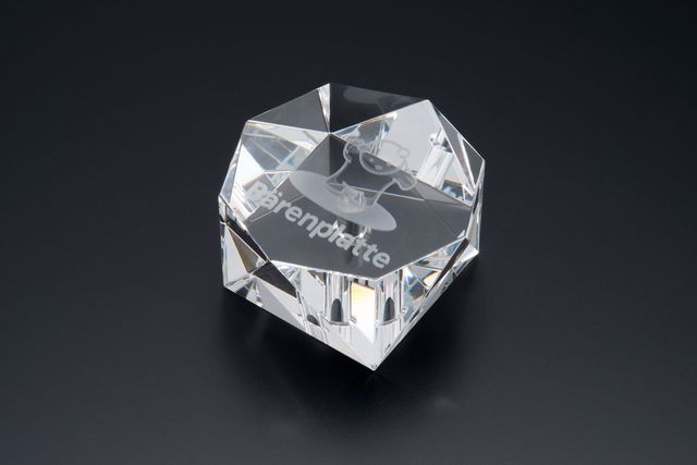 スタビライザーはクリスタル製で質量440g。同店のロゴとキャラクターが印字されている。