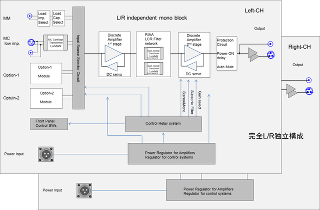 内部構成は左右完全モノブロック独立構成とし、左右の干渉をなくしたことで優れたチャンネルセパレーションを実現。また回路モジュールにオールディスクリートによるトランジスタ+FETを採用したこともユニークで、ハイゲイン、超低歪率、超低ノイズ、高ドライブ力を実現したという。