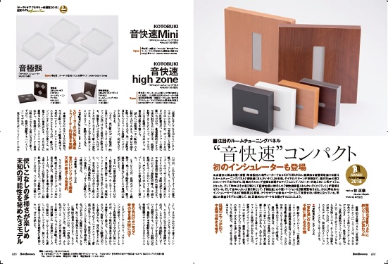 愛知県名古屋市に拠点を置く音響、防音設計の専門メーカーである(株)KOTOBUKIより、2種類のルームチューニングパネル「音快速(おんかいそく)Mini」と「音快速(おんかいそく)high zone」が発売された。価格は「音快速Mini」が1枚38,000円(税抜)、「音快速high zone」が1枚26,500円(税抜)。