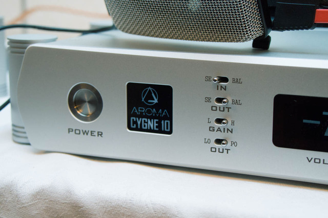 これまでイヤホンやポータブルヘッドホンアンプなどのポータブル製品を開発してきたAROMAからは、初の据え置きモデルとなるヘッドホンアンプ兼プリアンプ「CYGNE10」が発表。価格、発売日は現在も調整中とのこと。発表会では同社社長のツァン氏が登場して、具体的な製品の解説を行った。