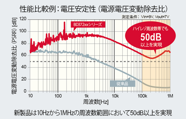 今回開発されたのは、低電圧の「BD37201NUX」、正電源に用いる「BD37210MUV」、負電源に用いる「BD37215MUV」の3モデル。開発経緯としては、ハイレゾ再生においては処理する信号レベルが従来より小さいため、オーディオデバイスへ供給する電源が音質に与える影響がより大きくなったことが挙げられている。