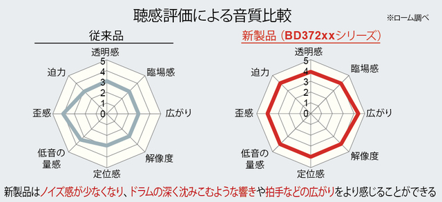 プレス向けの内覧会では、汎用の電源ICと高音質オーディオ用電源IC(正電源「BD37210MUV」、負電源「BD37215MUV」)を同じ回路で使用しての比較試聴も行われた。ヴィヴァルディ『協奏曲集「四季」作品8第4番ヘ短調<冬>第1楽章』(192kHz/24bit)では、大きな変化として楽器の定位が明瞭となり、分離感も高まった。付帯音がなくなり、一方で情報量が増して余韻や背景音が聴き取れるようになり、空間もより広がる。音の傾向を変えることなく、音の質だけを向上させていると感じた。
