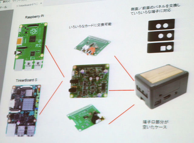 ワンボードオーディオ・コンソーシアムでは、ポータブル/デスクトップ型それぞれの、シングルボードコンピュータによるオーディオプラットフォームの規格策定を目指している。これまでは主にラズパイを使用してきたが、海上氏は「“音”が最重要であり、シングルボードコンピュータの選択基準」とし、「ラズパイにこだわっているわけではなく、実際にTinker Boardも試しており、ケースもTinker Boardを想定して製作している」という。