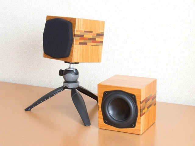 高井工芸のキューブ型スピーカー「HC-TX102」をベースにした特注モデル。エンクロージャーには国産本欅の天然無垢材を使用。さらに側面に箱根寄木細工をはめ込み、滑らかに仕上げることで、サウンドだけではなく見た目の心地よさも追求したとする。