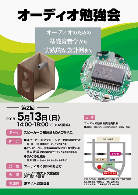 第2回となる今回は、「スピーカーエンクロージャーの最適設計法」「エンクロージャー設計(実践編)WiniSD の使い方」「DAC の仕組み」の3つのテーマで講演が行われる。参加費は無料で入退室も自由。詳細は下記をご参照いただきたい。